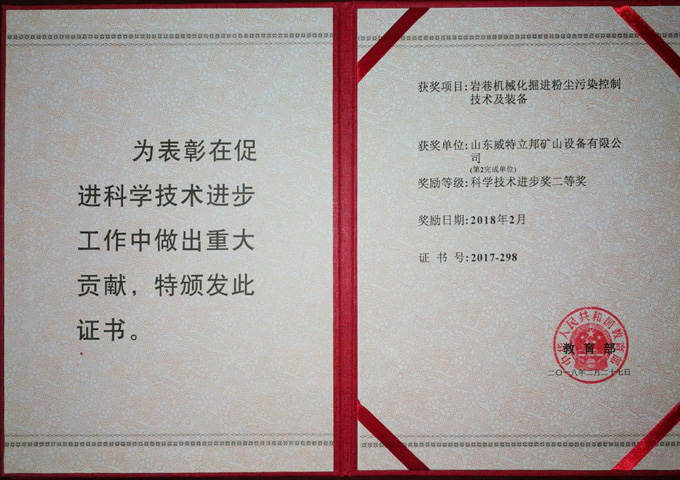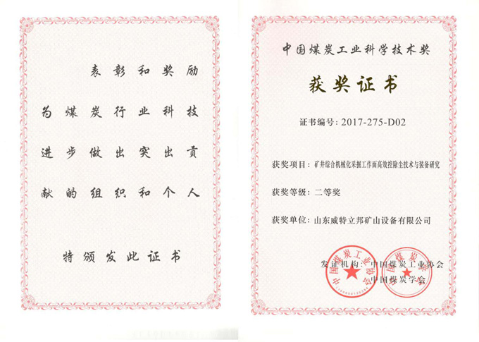 巖巷機械化掘進粉塵污染控制技術(shù)及裝備科學技術(shù)進步獎
