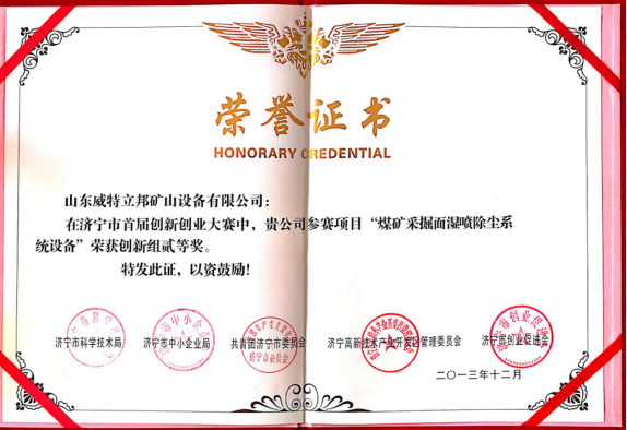 濟寧市首屆創(chuàng)新大賽“煤礦采掘面濕噴除塵系統(tǒng)設(shè)備”創(chuàng)新組二等獎